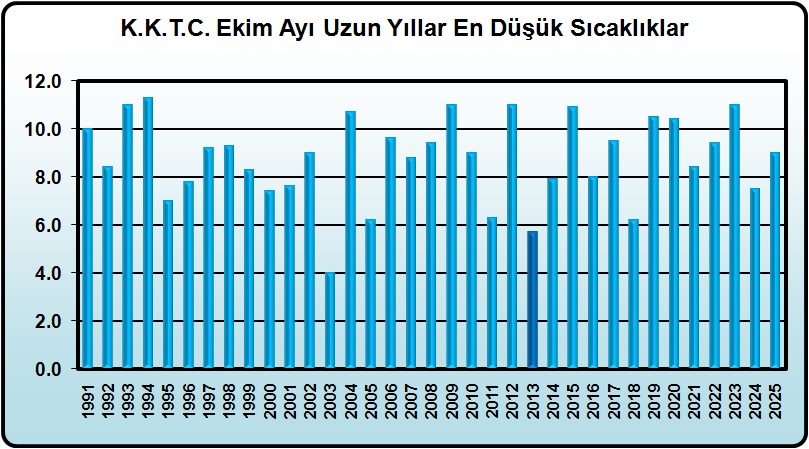 2025 yılı Ekim ayı K.K.T.C. ortalama en düşük hava sıcaklığı 17.1 °C değeri ile, uzun yıllar (1991-2020) ortalama hava sıcaklığından 0.3 °C daha yüksek, 2024 yılı Ekim ayı ile ise eşit düşük olarak hesaplanmıştır (Tablo 3). 2025 yılı Ekim ayında en düşük sıcaklık değeri 9.0 °C ile Orta Mesarya Bölgesi'nde bulunan Türkeli yöresinde ölçülmüştür.